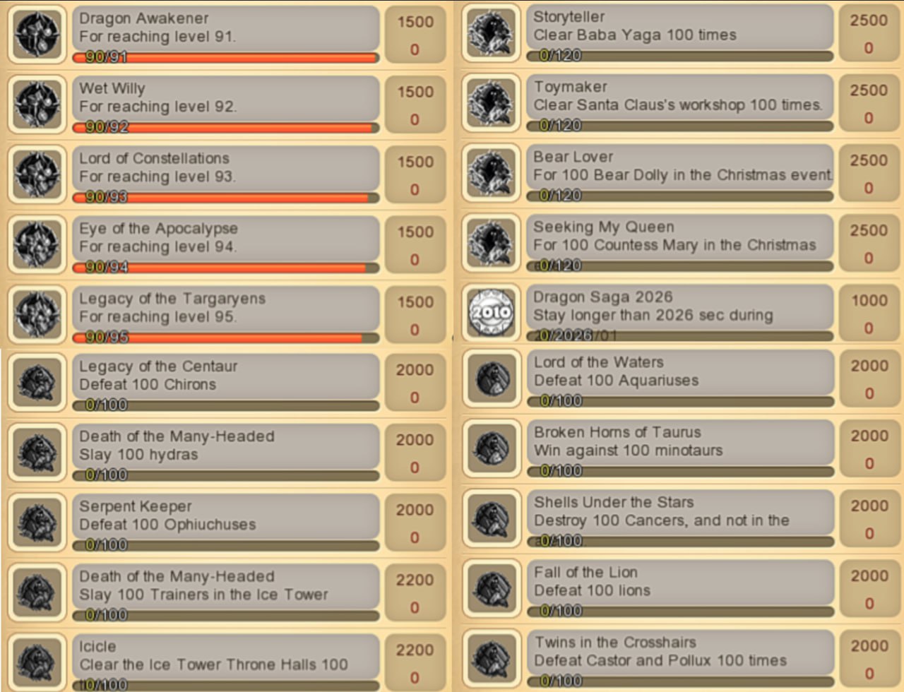 - Added new achievements for completing the Ice Tower, galaxy dungeons, obtaining new professions, and reaching new levels. Also added the Dragonica 2026 achievement, which requires logging into the game on January 1st, 2026 and staying in-game for 2026 seconds.