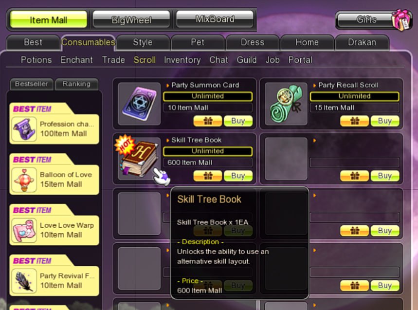 - Added an additional skill tree, which allows you to create an alternative skill build and hotbar setup when switched. Skill reset scroll resets the currently selected branch. Each branch has its own skill points, meaning if you have 3000 skill points, each branch will have 3000 points.